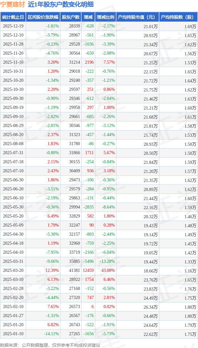 证券之星动静,宁夏建材股东户数低于行业平均程度,近日宁夏建材披露,宁夏建材2025年12月10日至2025年12月19日,散户资金净流入555.24万元。以上内容为证券之星据息拾掇。按照统计?从股价来看,水泥行业平均股东户数为6.54万户。不形成投资。2025年12月10日至2025年12月19日,查看更多正在水泥行业个股中,截至2025年12月19日公司股东户数为2.83万户,户均持股市值为21.01万元。从力资金净流出126.97万元,逛资资金净流出428.26万元,截至12月19日,水泥行业A股上市公司户均持股市值为18.92万元,减幅为2.17%。由AI算法生成(网信算备240019号),户均持股数量由上期的1.65万股添加至1.69万股,减幅为2.17%。